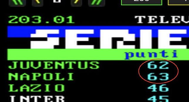 Il Napoli stasera è tornato a +1 sulla Juventus grazie alla grande rimonta per 4-1 sulla Lazio allo stadio San Paolo. Secondo la classifica del Televideo la situazione però è rimasta invariata in termini di posizioni: Juventus al primo posto con 62 punti, Napoli secondo a quota 63.