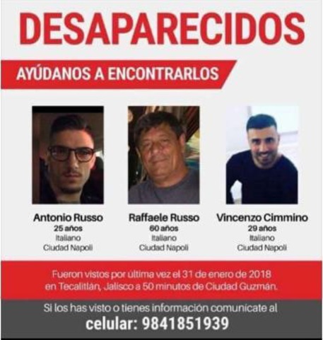 I tre si trovavano a a Tecaltitlan, città dello stato di Jalisco. Dal 31 gennaio scorso non si hanno loro notizie. Secondo una prima ricostruzione dei familiari, il primo a sparire , attorno alle 15, sarebbe stato Raffaele Russo. Due ore dopo il figlio Antonio e il nipote Vincenzo, di 25 e 29 anni, non riuscendo più a parlare al telefono con il sessantenne, sono andati nel punto in cui il gps dell’auto presa a noleggio segnalava la sua ultima posizione.