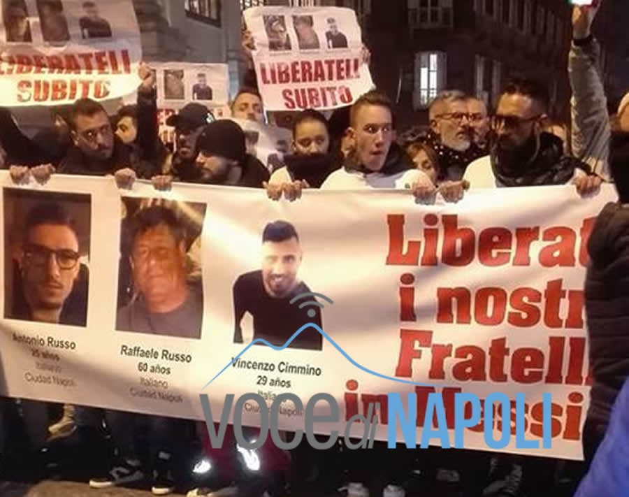 Al grido di “Liberi, liberi” parenti e amici sono partiti dalla zona della Case Nuove, dove risiedono i tre napoletani, fino ad arrivare in piazza Municipio e, dopo una prima sosta, concludere il corteo all’esterno della sede della Prefettura in piazza del Plebiscito. Qui i familiari sono saliti per incontrare una delegazione del prefetto Carmela Pagano che ha rassicurato i familiari garantendo che le istituzioni faranno il massimo per fare luce su quanto accaduto.