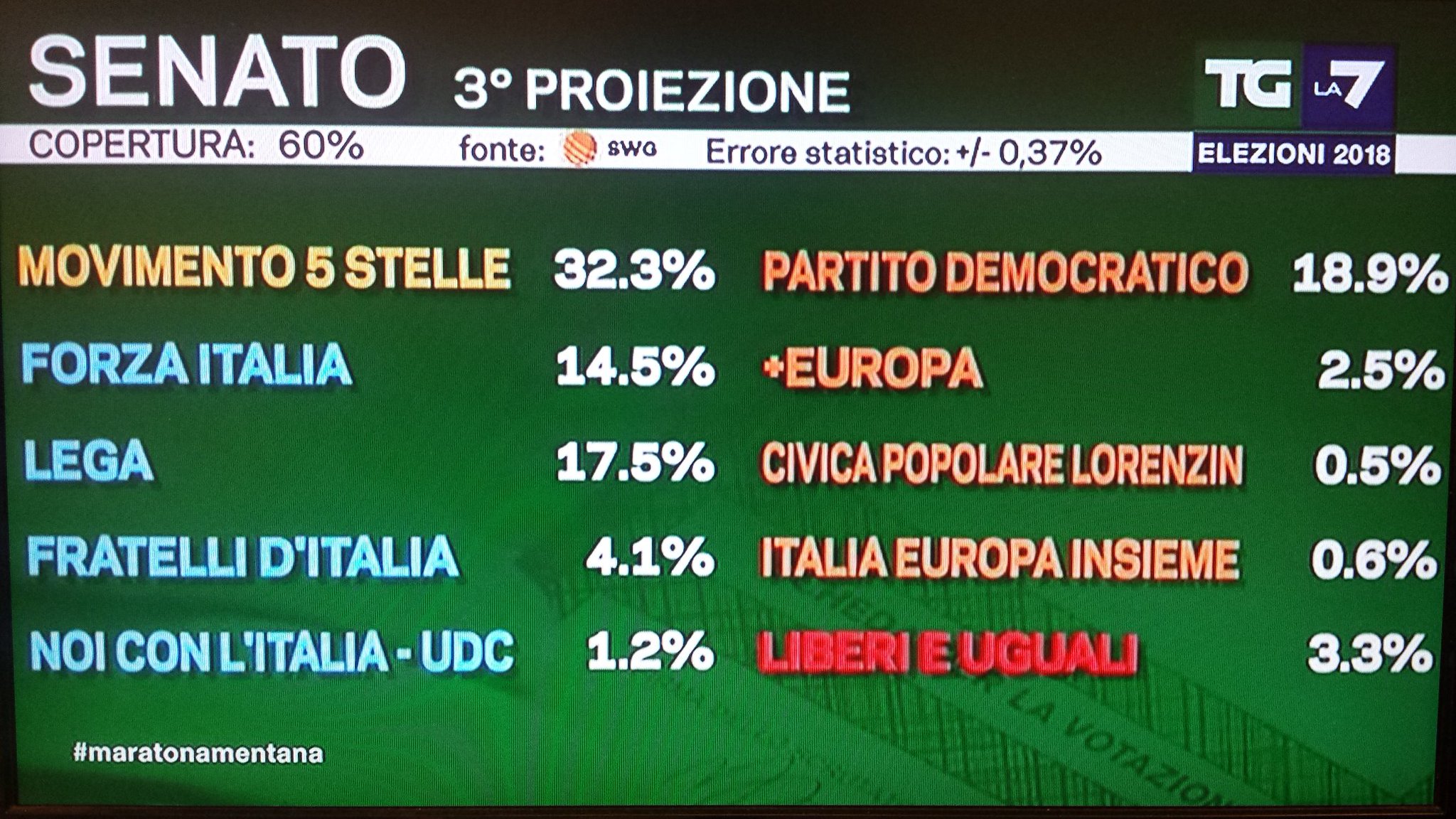 Ma le proiezioni ufficiali hanno stravolto questo dato preliminare. Infatti il Movimento 5 Stelle ha addirittura superato il 30% mentre il Partito Democratico si trova addirittura al di sotto del 20%. Ma le sorprese ci sono anche nello schieramento di centrodestra, dove la Lega di Matteo Salvini è il primo partito superando Silvio Berlusconi e Forza Italia. Se finisse così sarebbe u trionfo pentastellato, una disfatta storica per la sinistra e una destra a trazione leghista. Restano molti interrogativi sulla formazione del prossimo governo.
