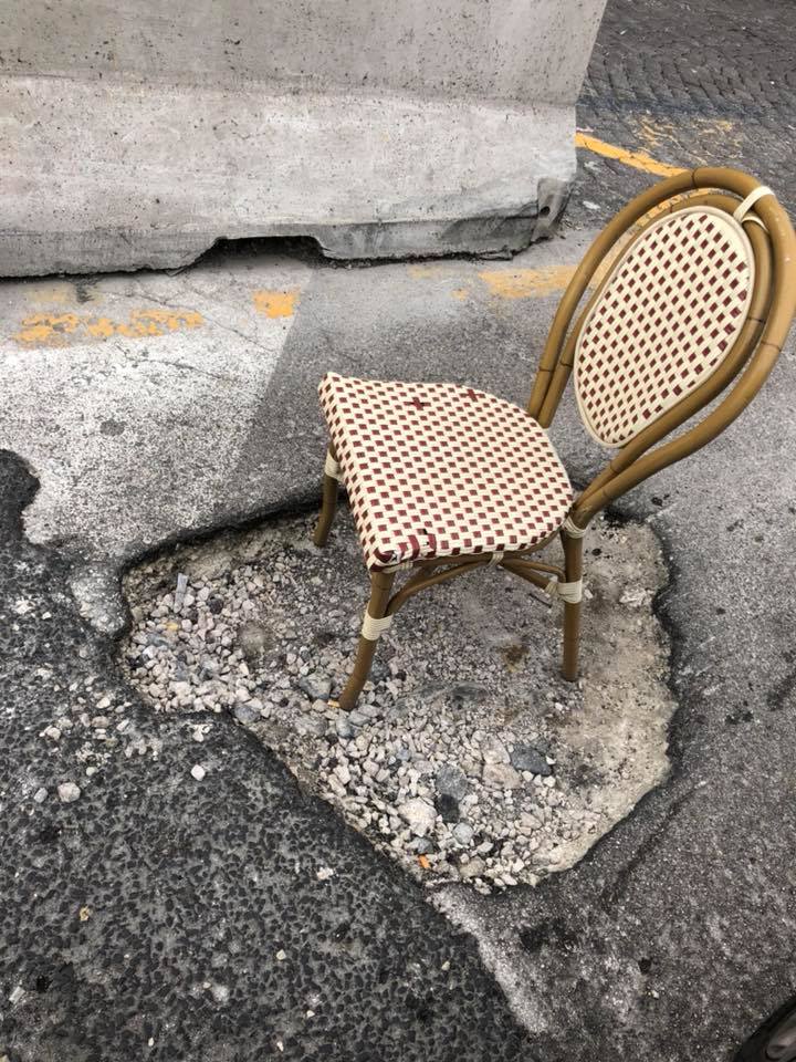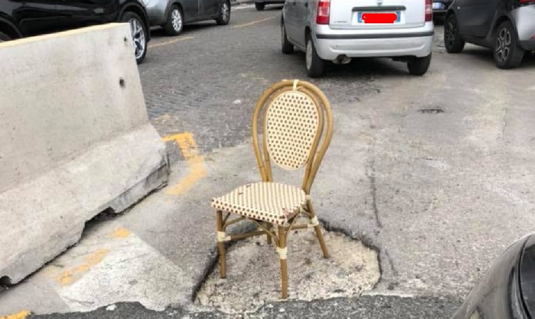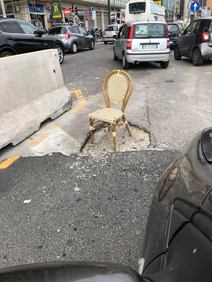 Infatti, a coprire l’ennesima buca propria del manto stradale cittadino, c’è una sedia. Esatto proprio una sedia. Non una volante dei vigili urbani (rimedio già di per se degradante) o una recinzione ben segnalata, ma una semplice e normalissima sedia. Non ci sorprenderebbe se qualcuno ci dicesse che sia stata messa li per consentire a un abusivo di potersi sedere e riprendere fiato dopo ore e ore di lavoro. Ma probabilmente e più realisticamente, sarà stata posizionata per evitare che quel fosso possa costituire un pericolo per la viabilità, considerato che avrà già fatto innumerevoli vittime tra sospensioni e ammortizzatori.