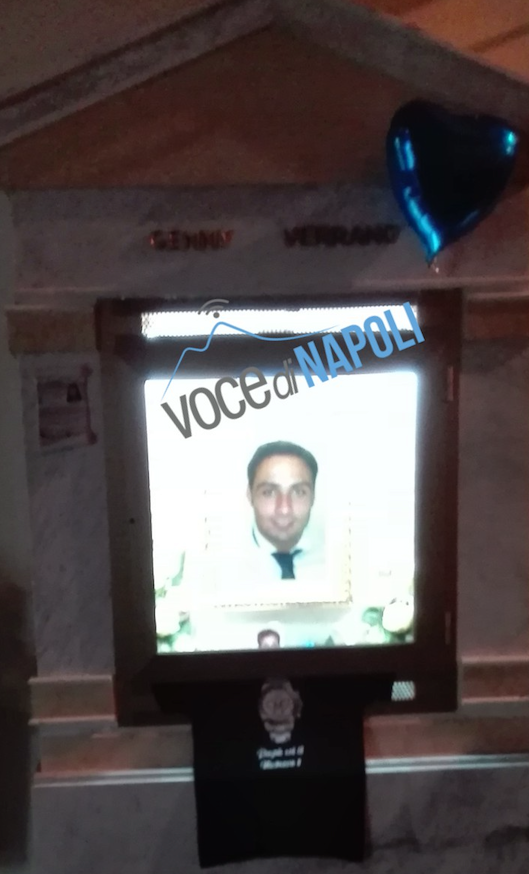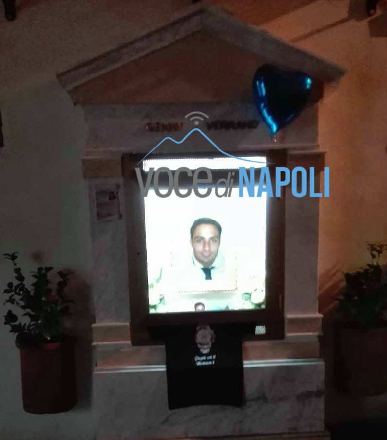 Come una cappella. Fatta in marmo, con scritta dorata, illuminazione led e tanto di tettoria per proteggerla dalla pioggia. All’interno della teca di vetro la foto di Gennaro Verrano, Sotto una maglietta con la stampa di un orologio e la scritta “Papà sei il numero 1” e sopra un palloncino blu a forma di cuore.