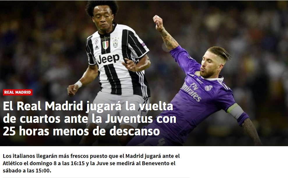 Una polemica sollevata dal quotidiano madrileno As.com, molto vicino agli ambienti blancos, che lamenta (riferendosi probabilmente alla federazione spagnola) al vantaggio che avrà la Juventus nel match di ritorno in programma l’11 aprile. Al “Bernabeu” infatti Higuain e compagni arriveranno con 25 ore di riposo in più grazie all’impegno in casa del Benevento in programma sabato 7 aprile alle ore 15 mentre il Real Madrid ospiterà nel derby contro l’Atletico Madrid la domenica alle ore 16.15. L’andata dei quarti di finale di Champions è invece fissata per martedì 3 aprile all’Allianz Stadium.