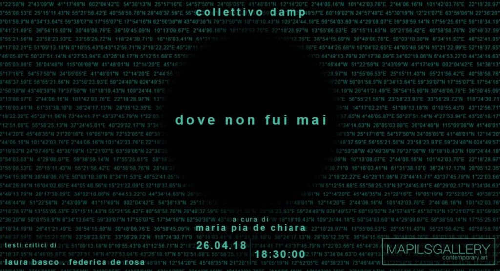 Dove non fui mai” è un’installazione site specific che intende investigare il concetto di “altrove” sia come discontinuità spazio-temporale sia come tensione-ambizione. Come ha spiegato Maria Pia De Chiara curatrice della kermesse: “Uniti dalla ricerca artistica sulla singolarità dei luoghi in questa prima personale alla MAPILSGALLERY il collettivo Damp intende esplorare alcuni dei possibili significati dell’altrove“.