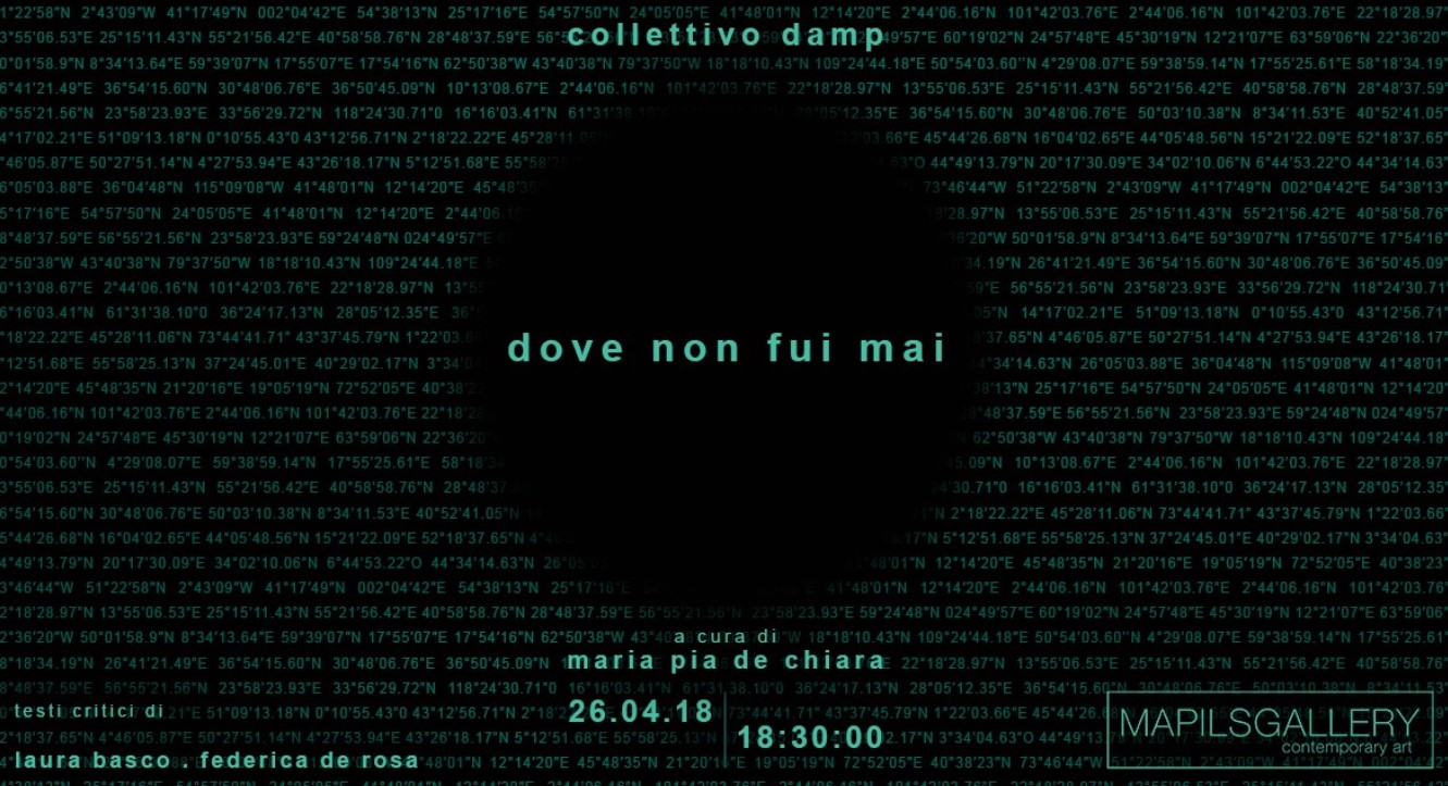“Dove non fui mai” è un’installazione site specific che intende investigare il concetto di “altrove” sia come discontinuità spazio-temporale sia come tensione-ambizione. Come ha spiegato Maria Pia De Chiara curatrice della kermesse: “Uniti dalla ricerca artistica sulla singolarità dei luoghi in questa prima personale alla MAPILSGALLERY il collettivo Damp intende esplorare alcuni dei possibili significati dell’altrove“.