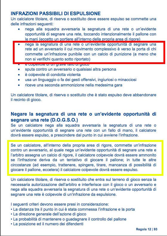 Rosso e punizione dal limite (e non rigore come inizialmente decretato dall’arbitro) che porta l’arbitro a mostrare il rosso a Koulibaly. Se l’intervento fosse stato in aria, il difensore napoletano avrebbe rimediato solo il cartellino giallo dopo le recenti norme entrate in vigore nel 2017 volte a evitare una tripla sanzione (rigore, espulsione e squalifica) in occasione di un calcio di rigore per fallo da ultimo uomo