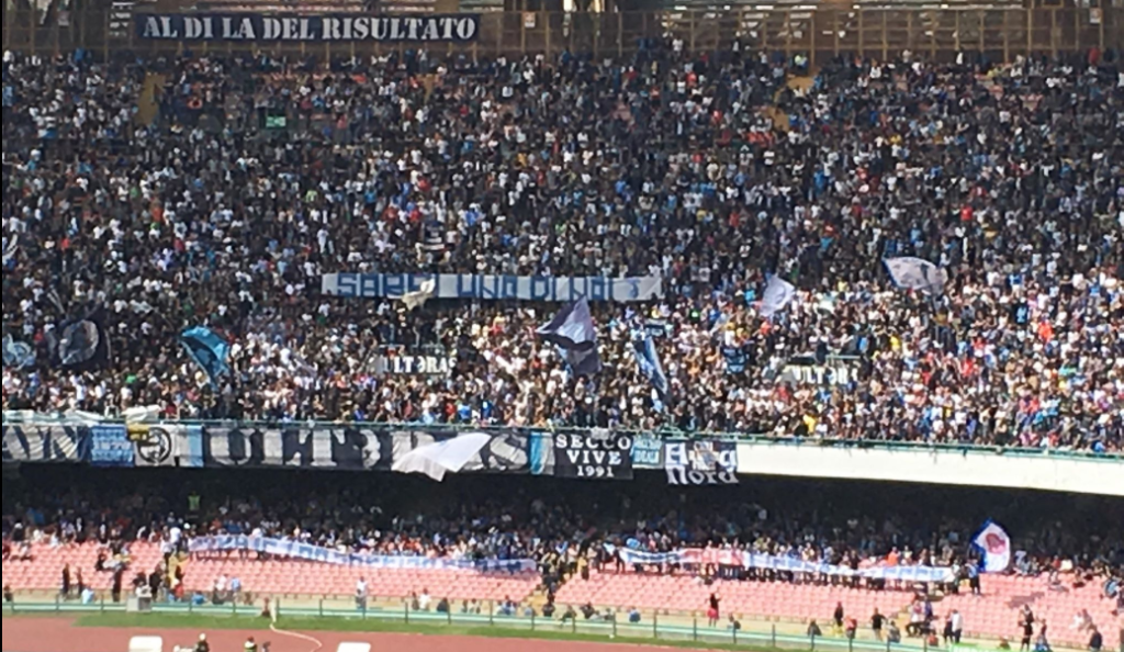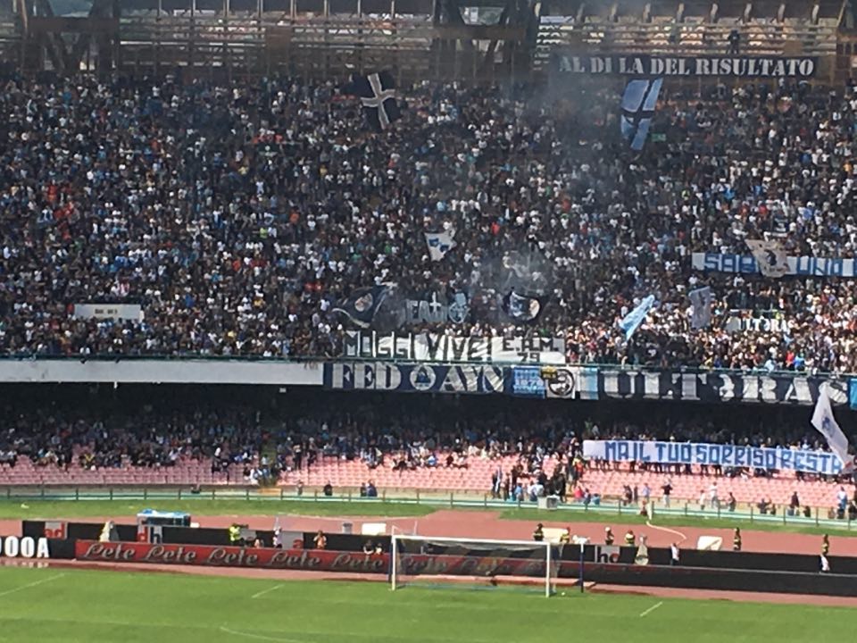 Gli animi accesi al San Paolo a seguito delle vicende arbitrali hanno infiammato tutta la Curva B, un enorme striscione recita “Sarri uno di noi” ma c’è un messaggio ben più forte anche per ADL, i tifosi azzurri che hanno manifestato pacificamente fuori allo Stadio all’interno cantano cori molto chiari: “Vai via da napoli, fuori i milioni”.
