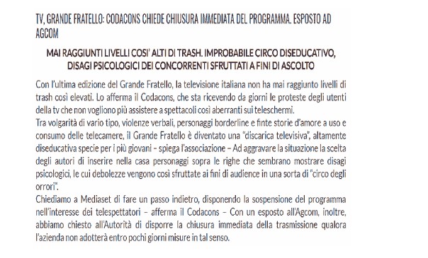 Nella nota diffusa tramite gli organi di stampa, l’associazione sostiene che con l’ultima edizione del GF attualmente in onda su Canale5 “la televisione italiana non ha mai raggiunto livelli di trash così elevati“. E afferma anche che: “Tra volgarità di vario tipo, violenze verbali, personaggi borderline e finte storie d’amore a uso e consumo delle telecamere, il Grande Fratello è diventato una “discarica televisiva”, altamente diseducativa specie per i più giovani“. “Ad aggravare la situazione – precisano però dall’associazione – la scelta degli autori di inserire nella casa personaggi sopra le righe che sembrano mostrare disagi psicologici, le cui debolezze vengono così sfruttate ai fini di audience in una sorta di “circo degli orrori“.