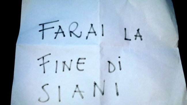 “Farai la fine di Siani”. Questo è il macabro messaggio che il video foto giornalista Salvatore Sparavigna ha ricevuto, non sui social, non in chat, non al telefono, ma con un “pizzino” rinvenuto nella propria cassetta postale al suo rientro a casa. L’episodio risale a venerdì 18 maggio ed è stato denunciato alle forze dell’ordine.