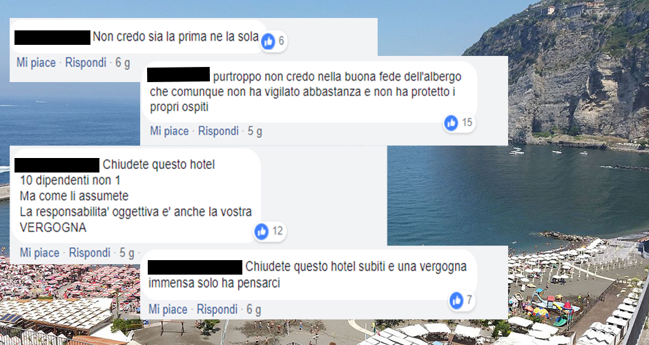 L’azienda si è dichiarata ovviamente estranea ai fatti, non potendo essere responsabile del comportamenti di soggetti dipendenti della struttura. Nonostante tutto però il web è invaso da commenti negativi che sottolineano la poca sicurezza presente all’interno dell’hotel. Anche il sindaco di Meta, Giuseppe Tito, ha ribadito la volontà del Comune di costituirsi come parte civile nel processo e ha sottolineato: “Se vorrà potrà tornare, sarà il modo per dimostrare alla signora e a tutti la nostra cultura di ospitalità. Dobbiamo esprimere solidarietà alla signora e difendere gli operatori turistici e i lavoratori stagionali”.