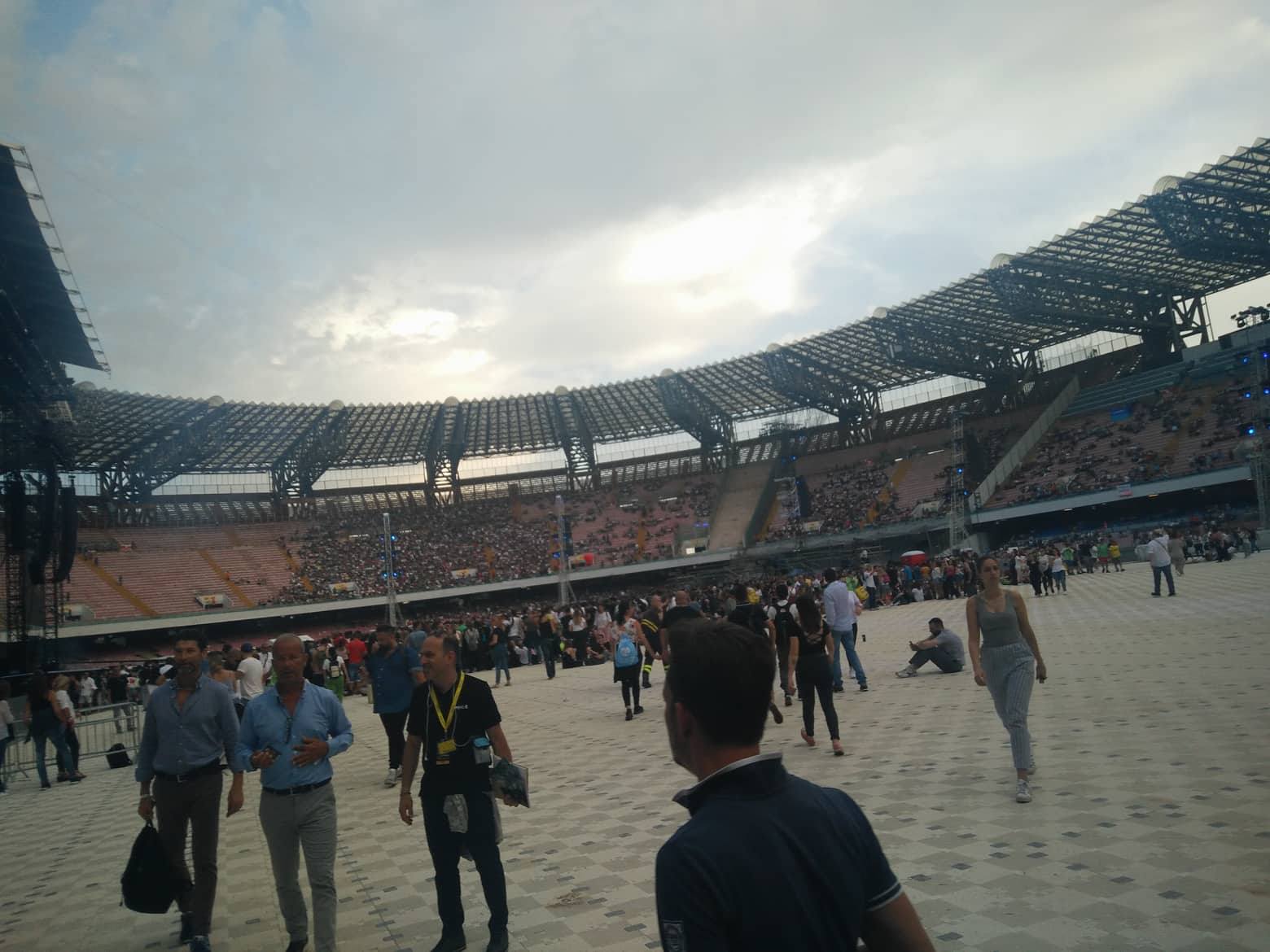 Nell’impianto di Fuorigrotta si prevedono circa 40mila persone. Non mancano i disagi per i tantissimi fan che hanno acquistato i tagliandi online per l’accesso al prato e che, probabilmente per problemi organizzativi, sono ancora in coda ai botteghini. All’interno del San Paolo, quando mancano meno di due ore all’inizio del concerto, il prato è ancora semivuoto mentre la curva A e la tribuna vanno pian piano riempiendosi.