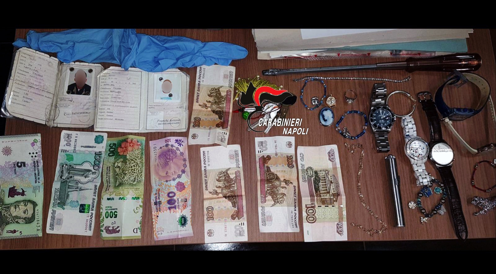 Inseguiti e bloccati, sono stati perquisiti: nelle tasche dei k-way avevano nascosto 6 orologi di varie marche tra cui “Rolex”, ori, banconote della Repubblica argentina e arnesi da scasso, torce e guanti di lattice. Sono stati denunciati per ricettazione e possesso di arnesi da scasso; il primo risponderà anche di aver violato gli obblighi legati alla libertà vigilata.