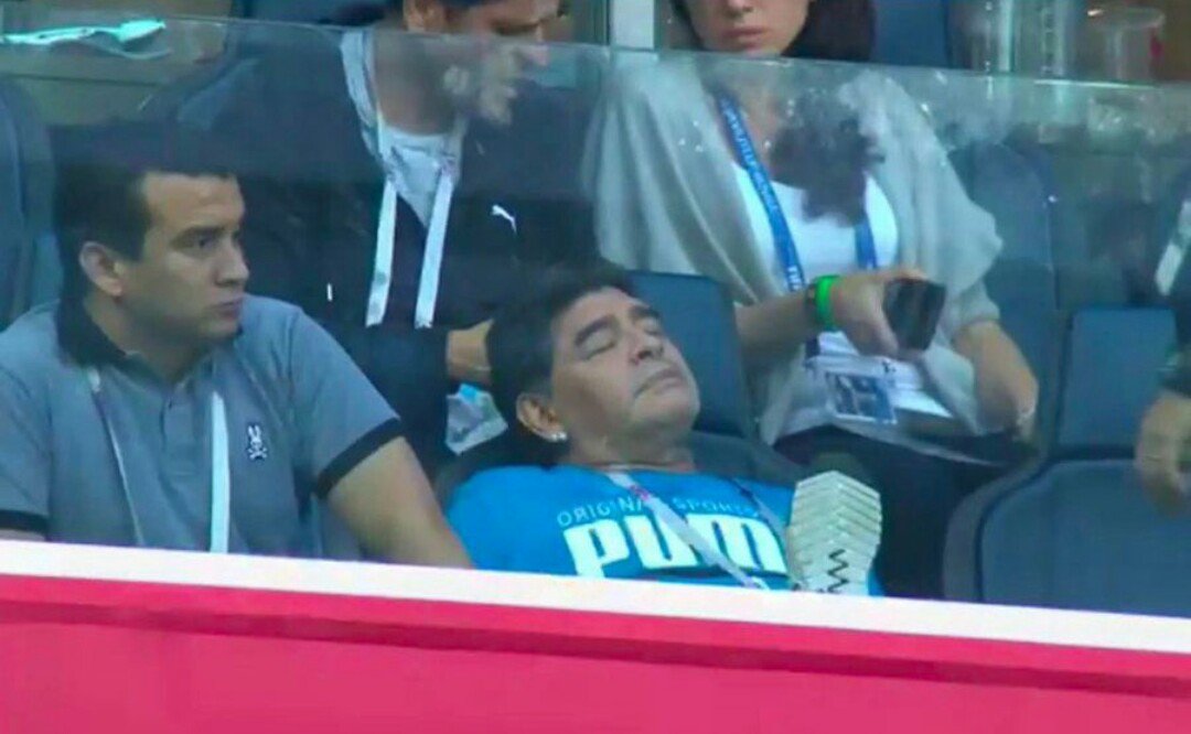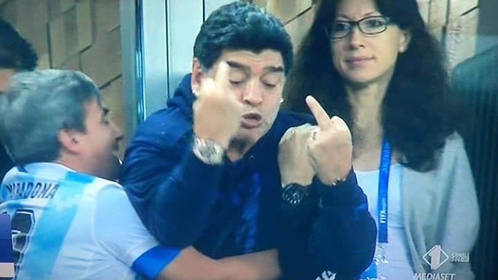 Diego Armando Maradona è stato autore di una performance niente male sugli spalti, sciorinando tutto il suo repertorio. Pose epiche, risate e sberleffi, pisolino nella fase noiosa della gara, esultanza spropositata (con tanto di dito medio) al gol qualificazione di Rojo.