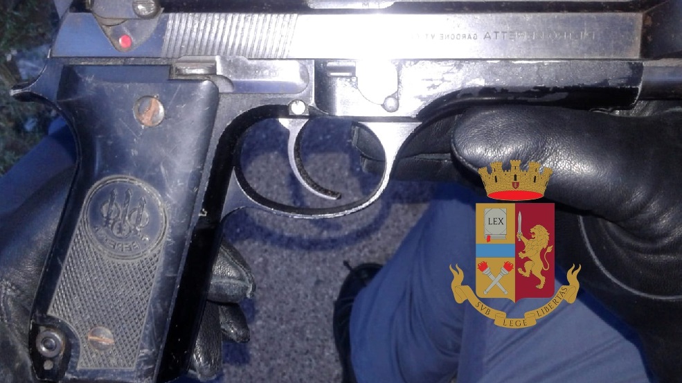 Il fuggitivo, vistosi braccato, tentava di scendere dal marciapiede speronando l’autovettura della Polizia. Durante questa manovra il centauro riusciva a far perdere le proprie tracce in direzione di via Mario Gigante e si disfaceva della pistola che aveva nella cinta dei pantaloni. I poliziotti hanno recuperato l’arma che è risultata essere una Beretta (modello 92 S, calibro 9×19) con matricola abrasa, completa con 11 cartucce con ogiva incamerata.