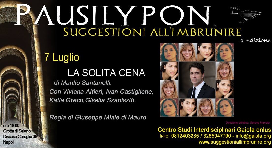 Per la quarta serata di “Pausilypon: Suggestioni all’Imbrunire”, la Rassegna stabile del Parco archeologico del Pausilypon, curata dal Centro Studi Interdisciplinari Gaiola onlus, con la direzione artistica di Serena Improta, d’intesa con la Soprintendenza Archeologia, Belle Arti e Paesaggio per il Comune di Napoli, ritorna la magia del teatro con “La solita cena” di Manlio Santanelli. Con Viviana Altieri, Ivan Castiglione, Katia Greco, Gisella Szaniszlo’. Mise en espace – Regia di Giuseppe Miale Di Mauro.