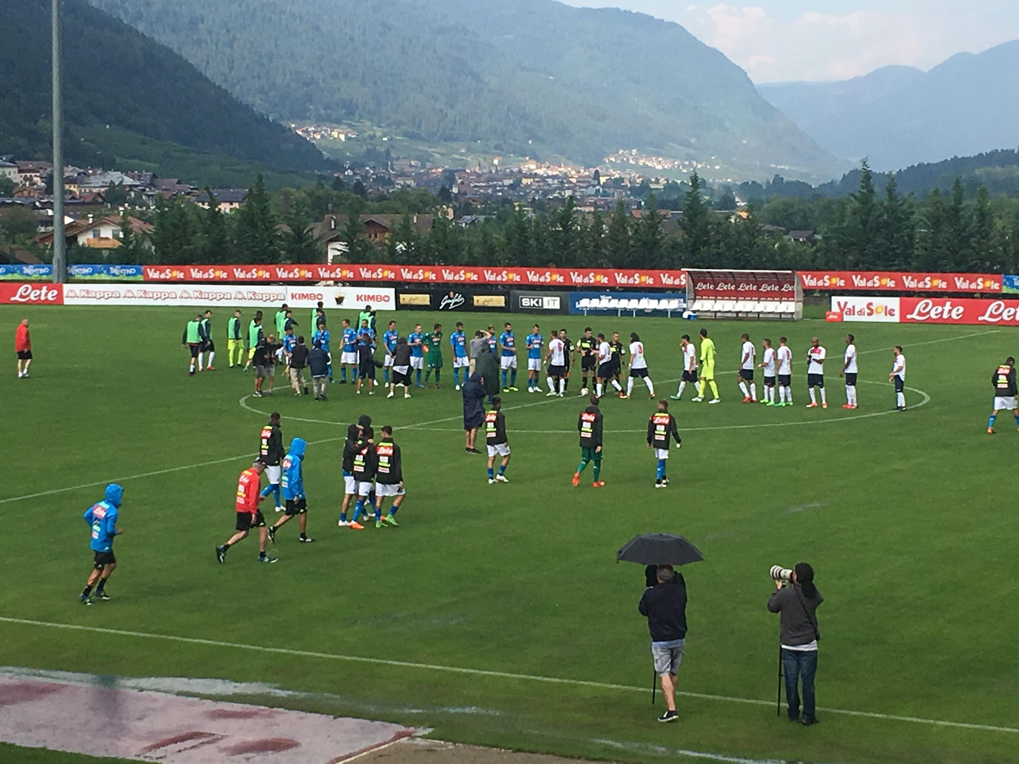 Prima uscita stagionale del nuovo Napoli di Carlo Ancelotti che affronta allo stadio comunale di Carciato a Dimaro i piemontesi del Gozzano (Lega Pro). Circa 2mila i tifosi, assiepati sulla tribunetta coperta, su quella scoperta, allestita per l’occasione quest’anno, e sul prato antistante la porta alla destra della tribuna. Dopo il sole di questa mattina, le condizioni climatiche sono rapidamente cambiate e l’inizio della gara è accompagnato dalla pioggia.