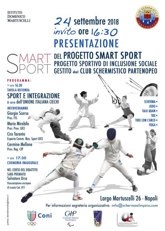 Sarà presentato lunedì 24 settembre alle 16,30 Smart Sport, il progetto sportivo di inclusione sociale, gestito dal Club Schermistico Partenopeo. All’Istituto Domenico Martuscelli, impegnato non da oggi nel Terzo Settore, grazie all’azione del commissario Andrea Torino, verrà illustrata l’iniziativa che mira a promuovere e consolidare il binomio sport e integrazione.