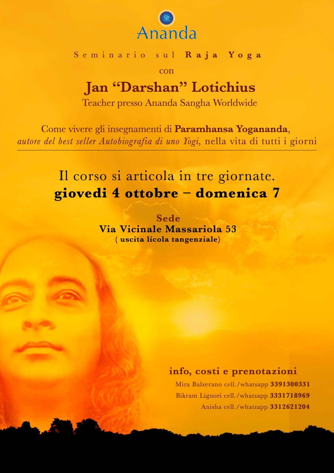 Il corso verrà presentato da “Darshan” Jan Lotichius, insegnante di Ananda Sangha Worldwide e residente nella Comunità Ananda di Assisi fondata da Swami Kriyananda, discepolo diretto di Paramhansa Yogananda, autore del famoso bestseller internazionale “Autobiografia di uno Yogi“.