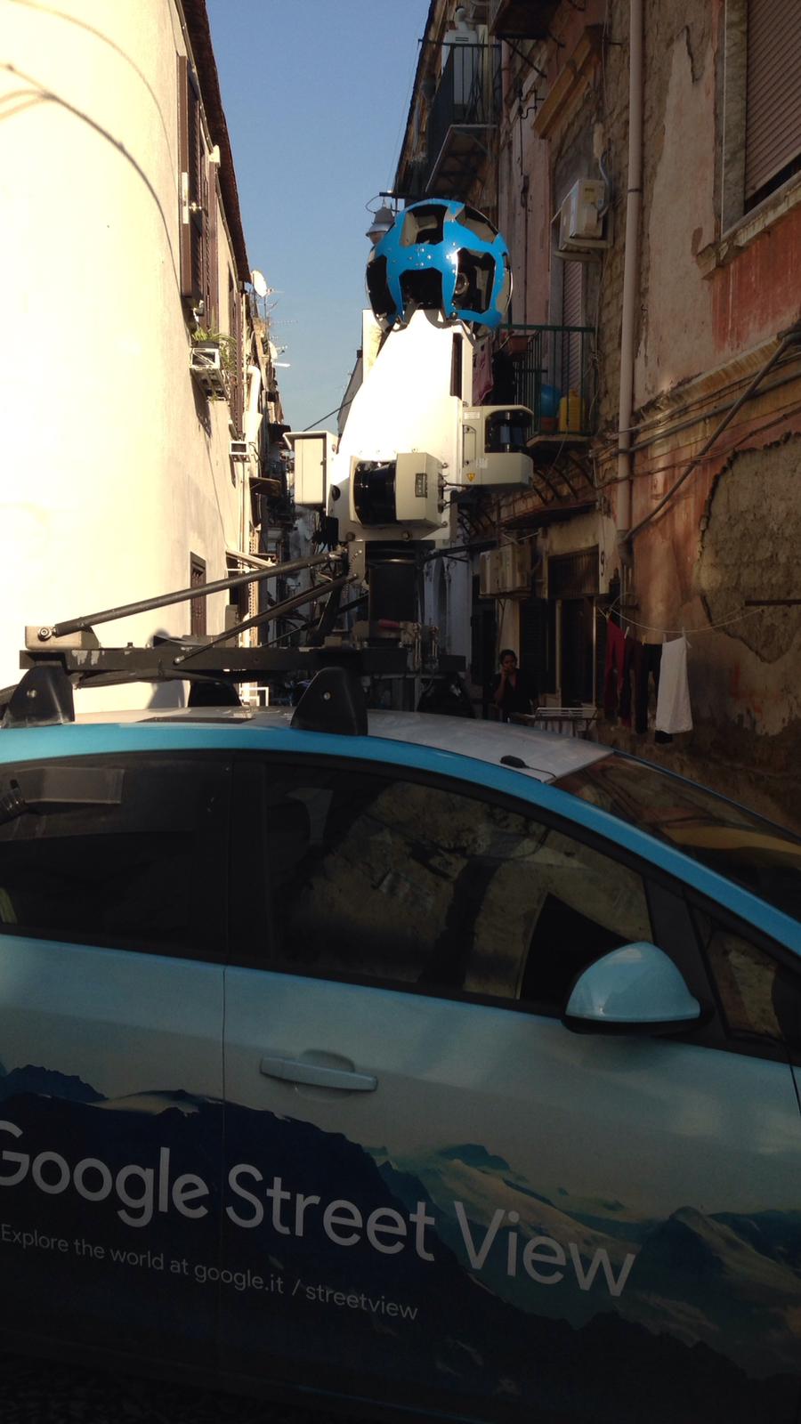 Proprio all’incrocio dell’antico “vico ‘e fiche“, tra la Caserma Garibaldi e piazza San Carlo all’Arena, l’auto dell’azienda di Mountain View ha dovuto fare decine di manovre per provare ad uscirne e riprendere la sua attività nel dedalo di vicoli e vicoletti di Napoli.