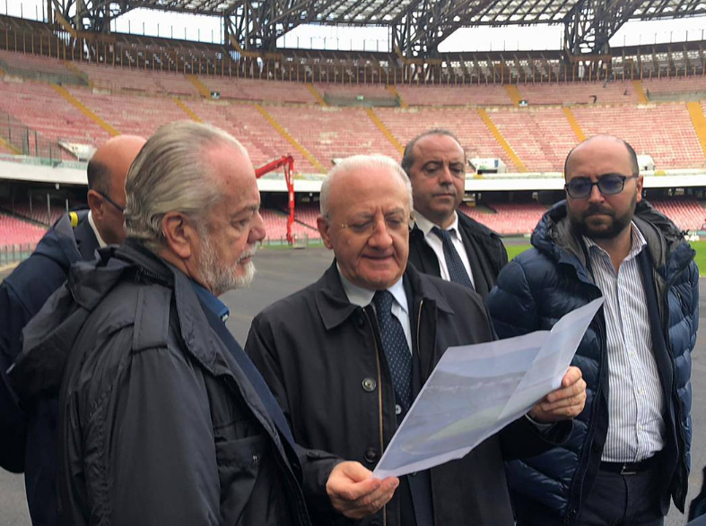 “Poi – ha proseguito De Luca – abbiamo visto il sottofondo realizzato con la pista d’atletica e i bagni nuovi. Abbiamo realizzato una parte degli impianti molto funzionali, civili, e poi proseguiremo con il cambio dei sediolini. Siamo molto contenti e credo che saremo in grado di ospitare le Universiadi in un contesto di grande bellezza e di grande valorizzazione per Napoli e per tutti quanti noi». Con De Luca c’era anche Aurelio De Laurentiis: «Il presidente era pienamente soddisfatto per un impianto di grande qualità. Per le partite di Champions e per le Universiadi – ha concluso – avevamo il dovere di fare interventi che consentissero all’impianto di fare il salto di qualità e mi pare che ci stiamo riuscendo”.