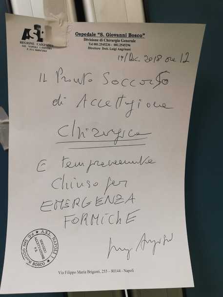 Che poi aggiunge: “Ho già parlato con il direttore generale della Asl Napoli 1 Forlenza che mi ha garantito la riapertura delle sale chiuse intorno alle 12 del pronto soccorso dopo una immediata disinfestazione. Quello che è successo oggi resta un fatto però di una gravità inaudita. Non è accettabile in alcun modo che un reparto resti chiuso a causa di un’invasione di formiche dalle ore 12 alle 13 circa. Le carenze igieniche negli ospedali sono un problema che deve essere affrontato immediatamente e strutturalmente. Occorre una attività preventiva determinata per evitare che scene come quella di oggi possano ripetersi”.
