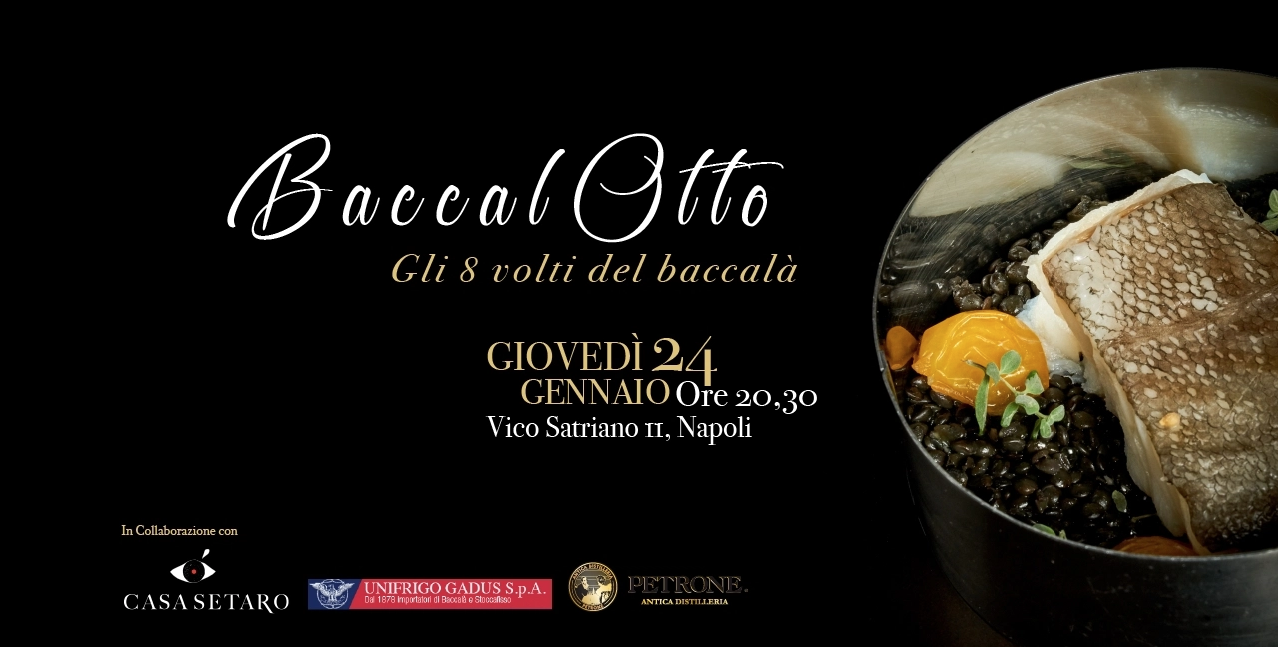 Tutto il baccalà impiegato nella preparazione delle portate proviene dalla rinomata azienda Unifrigo Gadus S.p.a della famiglia Eminente che vanta un’antica tradizione nel settore. Ad accompagnare il percorso di degustazione saranno i vini dell’azienda vesuviana Casa Setaro che per il dessert passeranno il testimone ai liquori dell’Antica Distilleria Petrone.