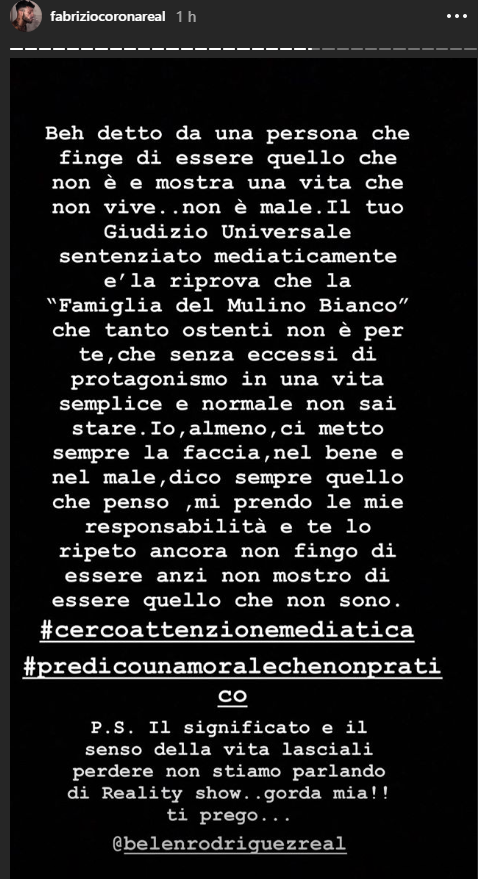 Fabrizio Corona risponde (con una’altra storia su Instagram) all‘attacco indiretto di Belen Rodriguez. L’argentina ha criticato la scorsa sera, in merito al reality l’Isola dei Famosi, l’atteggiamento dell’ex sentenziando con parole molto forti la clip di Corona. Le parole, pubblicate su Instagram, da Belen, non sono passate di certo inosservate. A notarle soprattutto Fabrizio che all’indomani ha a sua volta dichiarato: