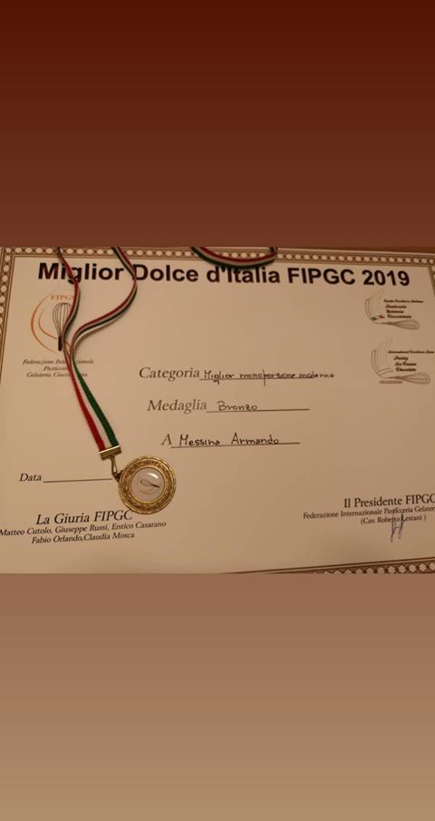 Messina si è aggiudicato la medaglia di bronzo nella categoria “migliore monoporzione 2019” grazie alla creazione “Agrumizia 67“, a base di agrumi e liquirizia. Nonostante la giovane età, ha iniziato a lavorare nel mondo dei dolci da quando aveva 16 anni. Un riconoscimento prestigioso alla sua prima partecipazione ad un concorso promosso dalla FIPGC. Un dolce legato al territorio d’origine, valorizzandone i prodotti tipici.