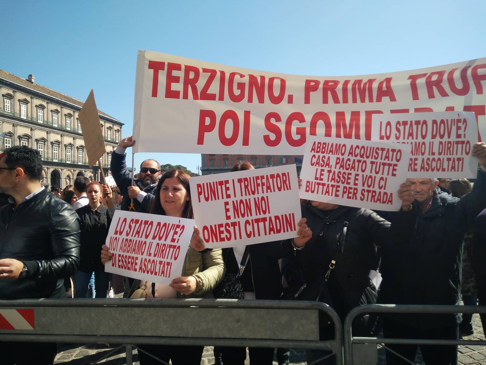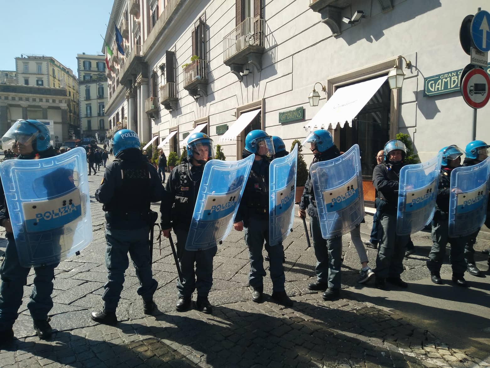 Si sono vissuti momenti di tensione tra i manifestanti e i poliziotti in assetto antisommossa, poi tutto è rientrato ed è stato consentito al corteo, alle 13.15, di arrivare in piazza del Plebiscito.
