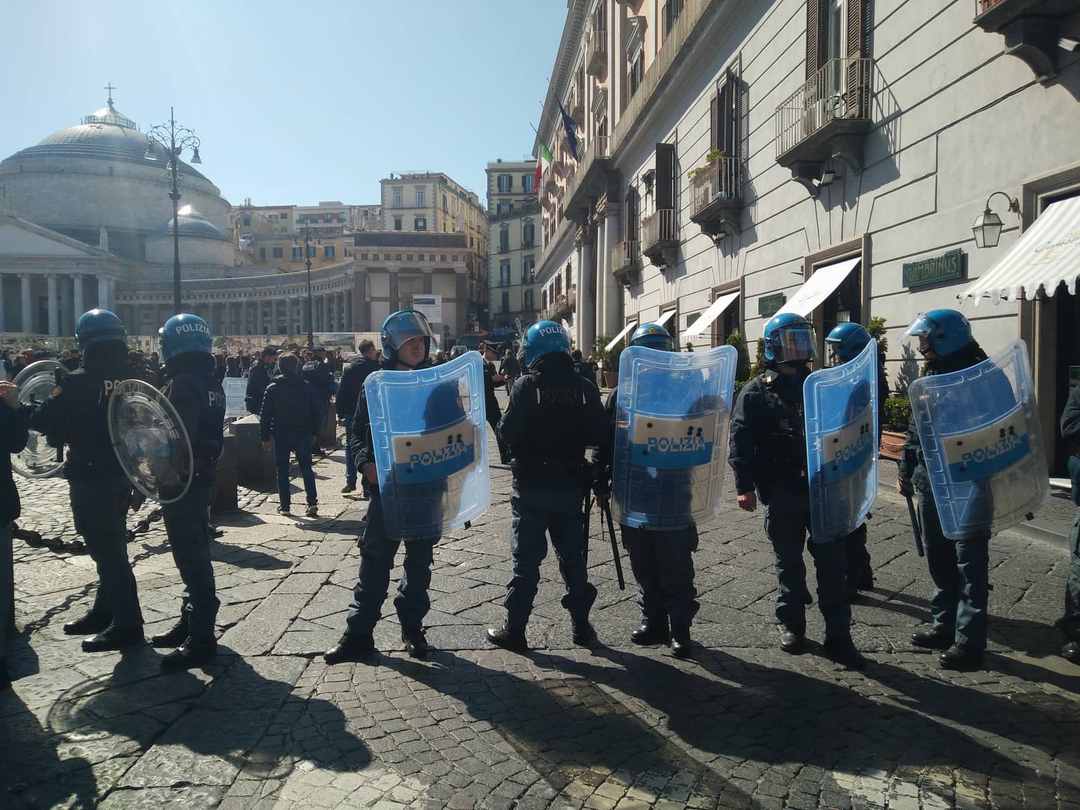 Si sono vissuti momenti di tensione tra i manifestanti e i poliziotti in assetto antisommossa, poi tutto è rientrato ed è stato consentito al corteo, alle 13.15, di arrivare in piazza del Plebiscito.