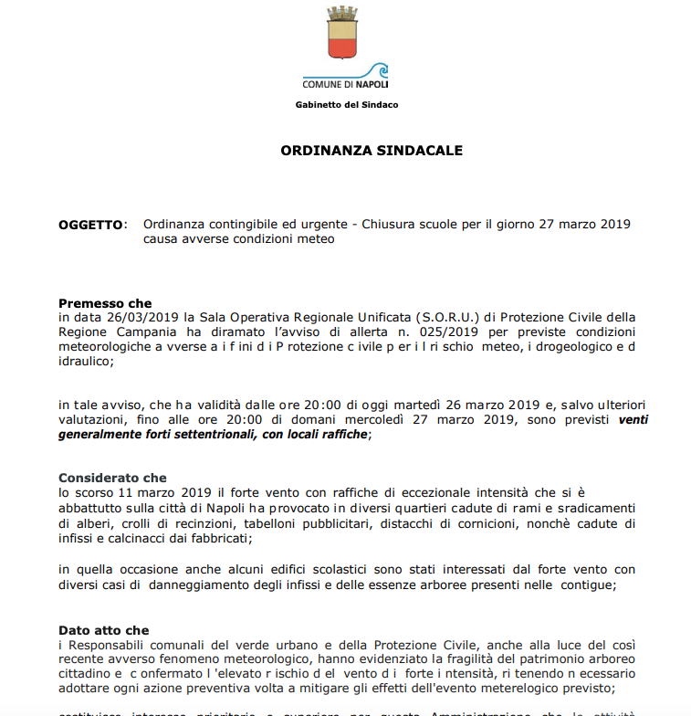 L’allerta meteo per le forti raffiche di vento e per il mare agitato, diramata dalla Protezione civile della regione Campania a partire dalle 20 di martedì sera e fino alle 8 di giovedì mattina, ha fatto partire un giro di voci e indiscrezioni che vorrebbero, ancora una volta, le scuole della città di Napoli chiuse per la giornata mercoledì 27 marzo.