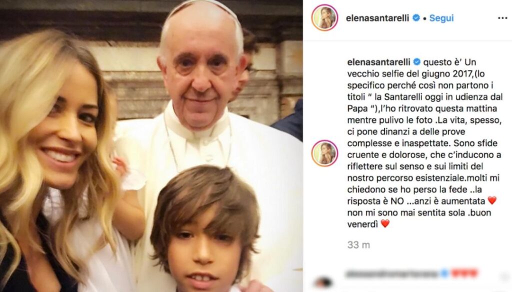 Accanto alla foto con il pontefice e il bambino, la showgirl ha scritto un messaggio di speranza: “Questo è un vecchio selfie del giugno 2017, l’ho ritrovato questa mattina mentre pulivo le foto. La vita, spesso, ci pone dinanzi a delle prove complesse e inaspettate. Sono sfide cruente e dolorose, che ci inducono a riflettere sul senso e sui limiti del nostro percorso esistenziale. Molti mi chiedono se ho perso la fede – scrive la Santarelli – la risposta è NO. Anzi è aumentata, non mi sono mai sentita sola”.