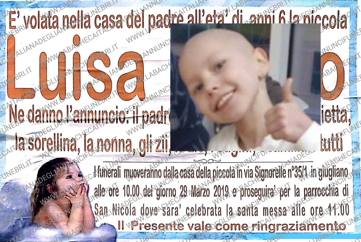 Si sono svolti alle 11 i funerali della piccola Luisa, la bimba di sei anni stroncata da un male incurabile nei giorni scorsi dopo una lunga battaglia. Residente a Giugliano in Campania, popoloso comune a nord di Napoli, la piccola è stata salutata per l’ultima volta nella chiesa di San Nicola alla presenza di centinaia di persone. Palloncini bianchi e dieci colombe liberate hanno accompagnato l’uscita della bara bianca al termine della cerimonia funebre.