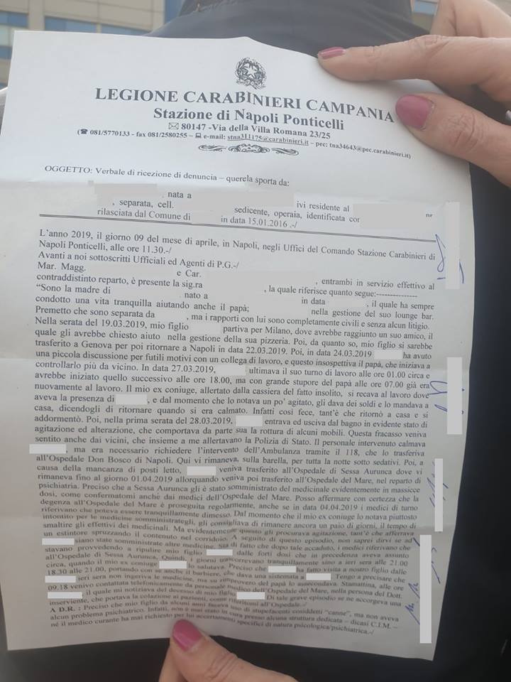 “Stando a quanto riportato nella denuncia – spiega Borrelli – il giovane, dedito all’uso di cannabis, era stato sottoposto a trattamento psichiatrico ospedaliero dal 28 marzo quando, in palese stato di agitazione, aveva danneggiato l’abitazione in cui viveva. Trasportato prima all’ospedale San Giovanni Bosco veniva poi trasferito all’ospedale di Sessa Aurunca dove, spiegano i genitori, veniva sottoposto ad una massiccia terapia a base di psicofarmaci. Il primo aprile è stato poi nuovamente trasferito all’Ospedale del Mare dove il 4 aprile i medici di turno, secondo quanto contenuto nella denuncia, avevano affermato di ritenerlo pronto per la dimissione. Dietro suggerimento del padre il giovane è rimasto presso il nosocomio di Ponticelli fino alla morte, constatata nella mattinata di martedì 9 aprile. Tenendo conto che, in base a quanto contenuto nella denuncia, fino al giorno precedente le condizioni erano in miglioramento, tanto che il giovane si era fatto anche tagliare i capelli, appare strana la morte, sopraggiunta probabilmente durante la notte. Secondo i genitori sarebbe ipotizzabile l’imperizia da parte del personale medico come causa del decesso, occorre dunque un’inchiesta interna per ricostruire la vicenda e fare luce”.