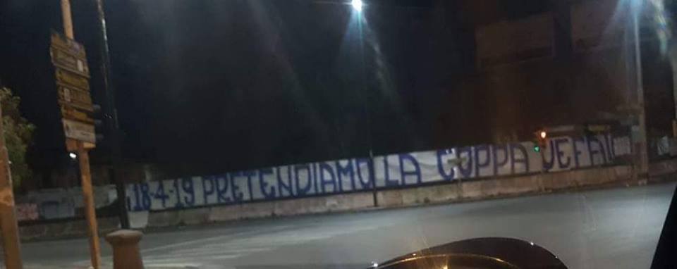 Pretendere. Non una semplice richiesta. La curva B, o meglio, gli ultrà del settore popolare dello stadio San Paolo hanno tappezzato la città di striscioni con un messaggio eloquente: “Pretendiamo la Coppa Uefa” con tanto di data (18-4-19), quella di giovedì, in cui è in programma la sfida di ritorno dei quarti di finale di Europa League contro l’Arsenal.