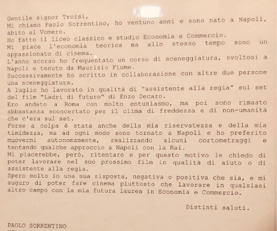 Il futuro regista, premio oscar per “La Grande Bellezza” – all’epoca studente di economia e commercio – chiedeva al Maestro Troisi di iniziare a collaborare con lui come aiutante alla regia per coltivare il suo sogno, ad oggi, diventato realtà.