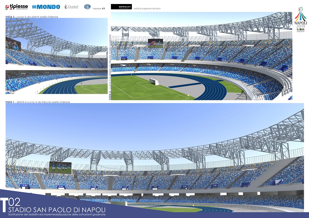 Un mix di cinque colori, con predominanza dell’azzurro per il nuovo volto dello Stadio San Paolo. L’ATI aggiudicataria dei lavori di sostituzione dei seggiolini ha consegnato al Commissario straordinario Gianluca Basile i rendering che presentano il nuovo volto dello stadio, che ospiterà la cerimonia di apertura dell’Universiade, in programma il 3 luglio, oltre alle gare di atletica leggera. È stato ottenuto, in base a quanto richiesto, l’effetto pixellato con cinque colori (azzurro, blu, grigio, bianco e giallo) per i nuovi seggiolini, con la dominanza dell’azzurro che richiama il blu e grigio della pista d’atletica. Nell’impianto procedono secondo cronoprogramma i lavori per la sostituzione dei seggiolini ed è già stato completato l’impianto di illuminazione e l’impianto audio.