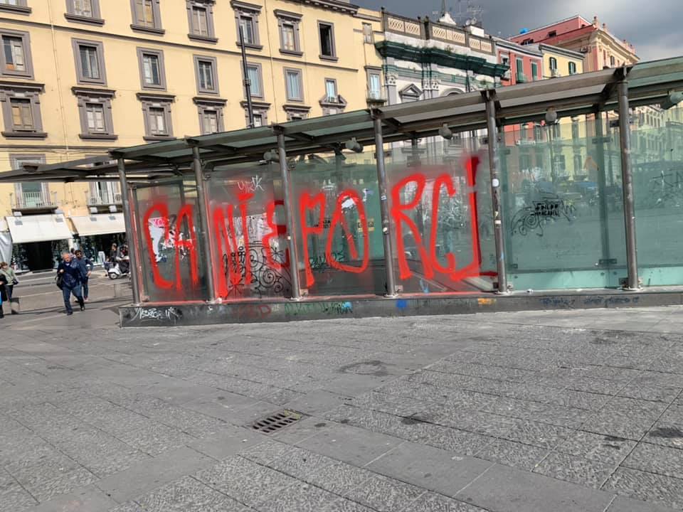 “Prima, durante o dopo il concerto del 1 maggio, Cani e Porci, più porci che cani o meglio più deficienti che porci, persone asociali, sociopatiche, non animali ma esseri umani poco umani imbecilli oltre che deficienti hanno pensato bene di scrivere sulla vetrata della stazione metro di Piazza Dante, già malridotta ed oltraggiata, “CANI E PORCI” con vernice rossa. A Questi esseri dementi mandiamo ogni “benedizione” in particolare ai loro genitori perché loro sono proprio dei gran figli di …. nemici di Napoli e dei Napoletani…. che schifo!”.