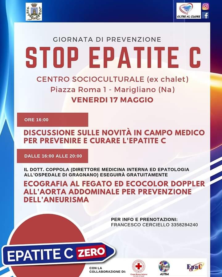 Venerdì 17 maggio presso il Centro Socioculturale (ex chalet della villa comunale) è in programma una giornata dedicata alla prevenzione dell’epatite C dal nome “Stop Epatite C“, organizzata dall’Associazione Oltre al cuore con il patrocinio del Comune di Marigliano.