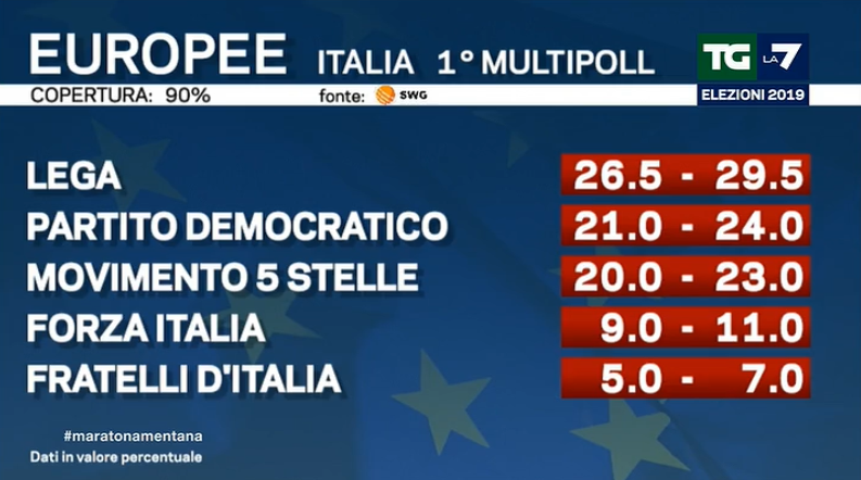 Secondo invece i sondaggi di Swg per La7, la Lega è il primo partito di queste Europee con un risultato tra il 26,5% e 29,5%, il Pd tra il 21% e il 24%, il M5s tra 20%e 23%, Forza Italia tra il 9 e l’11%, Fratelli d’Italia tra il 5 e 7%, Più Europa-Iic 2,4-3,5%, la Sinistra tra 2 e 3%, Europa Verde tra 1,5 e 2,5%.