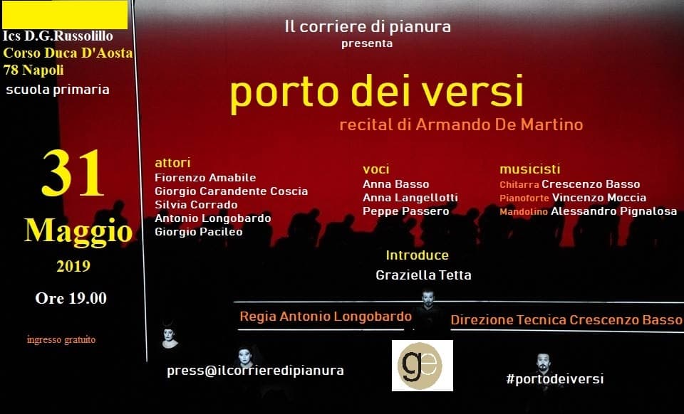 “Porto dei versi“. Si chiama così il viaggio tra poesia e musica in programma venerdì 31 maggio (ore 19) all’istituto comprensivo statale Don Giustino Russolillo. La kermesse è organizzata da Il Corriere di Pianura, sempre presente, non solo sul territorio, ma anche in ambito cittadino dopo aver partecipato alle manifestazioni patrocinate dal Comune di Napoli nell’ambito di marzo donna e del giorno della memoria.
