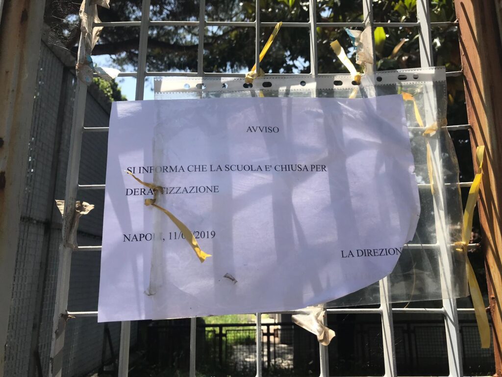 Da martedì 11 giugno la scuola è chiusa ed è in attesa della derattizzazione dopo il rinvenimento di un topo. Non è ancora chiaro quando riaprirà perché al momento non ci sarebbero i fondi per sostenere la spesa. Circostanza questa che ha provocato la protesta dei genitori che a inizio giugno hanno pagato la rata per l’intero mese. “E’ una vicenda grottesca” racconta la mamma di un piccolo che frequenta la classe del micro nido. “La preside ci ha ricevuto spiegandoci che purtroppo non dipende da lei. La derattizzazione è competenza della Napoli Servizi che al momento non avrebbe i fondi. Anche la IX Municipalità Pianura-Soccavo ci ha detto la stessa cosa”.