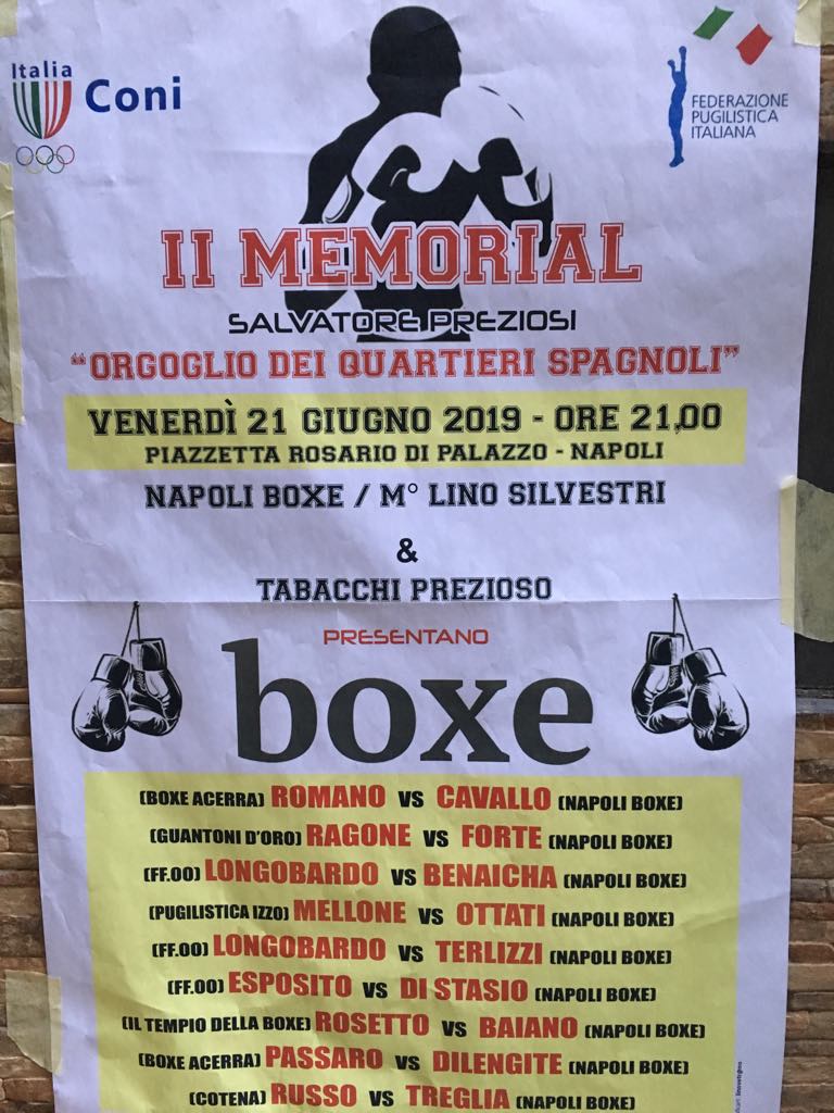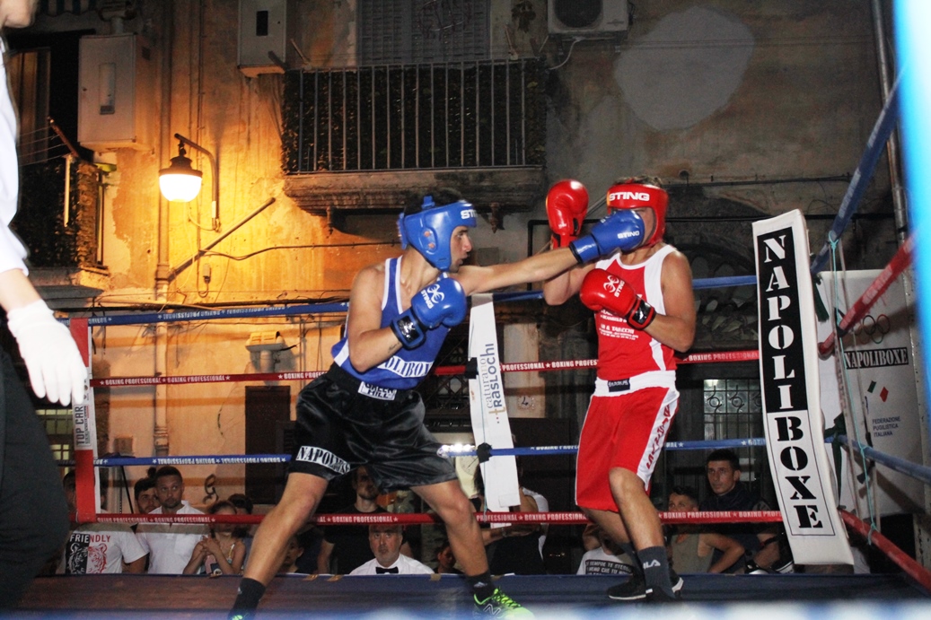 Non poteva andare meglio il primo appuntamento in piazza del 2019 per la Napoliboxe del maestro Lino Silvestri. Nella seconda edizione del Memorial Salvatore Preziosi, compianto pugile nato ai Quartieri Spagnoli, gli allievi della palestra di vico Sottomonte ai Ventaglieri hanno vinto sei incontri su otto (con due pari) sul ring allestito in piazzetta Rosario di Palazzo contro avversari provenienti da Campania e Puglia. Alla riunione erano presenti il presidente della FPI Campania, Alfredo Raininger, il campione dell’Unione Europea dei pesi leggeri professionisti Gianluca Ceglia, l’ex pugile Roberto Chiacchio, e Stefano Preziosi, figlio di Salvatore.