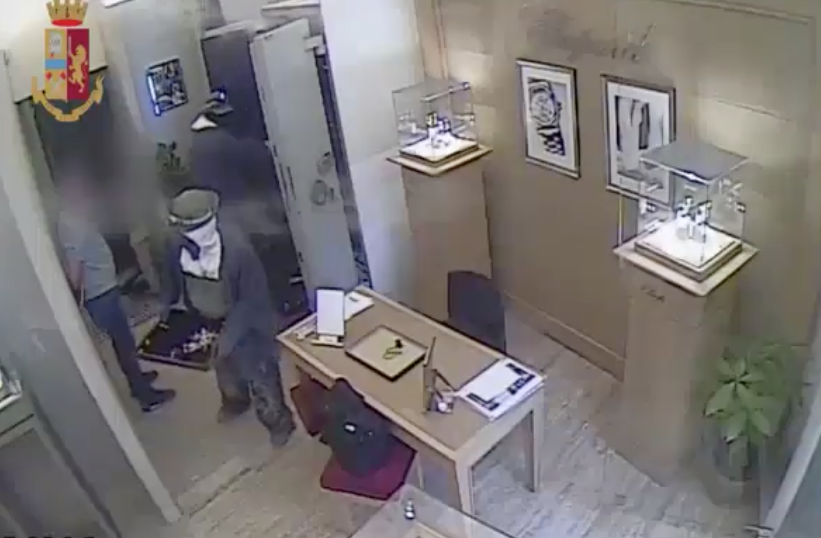 Rapina consumata l’11 giugno 2019 in danno della gioielleria “Trucchi” sita in questa via Santa Caterina a Chiaia laddove mediante minaccia, consistita nell’immobilizzare un dipendente dell’esercizio commerciale e nel puntare al suo indirizzo una pistola e mediante minaccia, consistita nel puntare la pistola all’indirizzo degli agenti di Polizia successivamente intervenuti, si impossessavano di numerosi orologi di valore ed oggetti preziosi custoditi all’interno della cassaforte, del valore di oltre 800.000,00 euro.