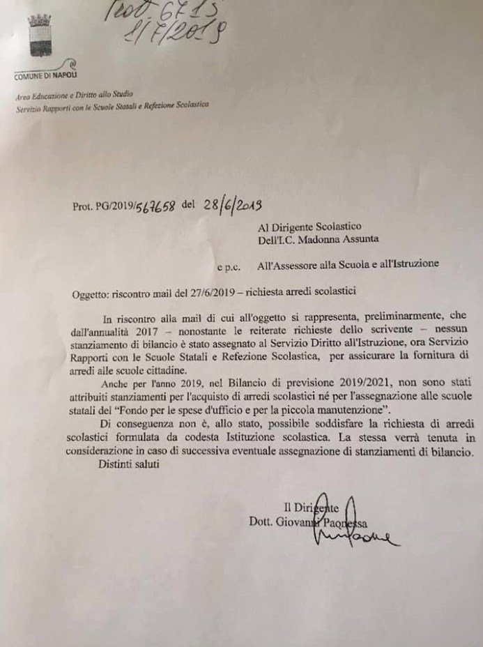 La Dirigente scolastica aveva inviato una richiesta ufficiale a Palazzo San Giacomo per avere nuovi banchi e sedie per ospitare i nuovi alunni (l’istituto avrà un affluenza da 600 a 700 ragazzi) . Ma la risposta del Comune è stata negativa.