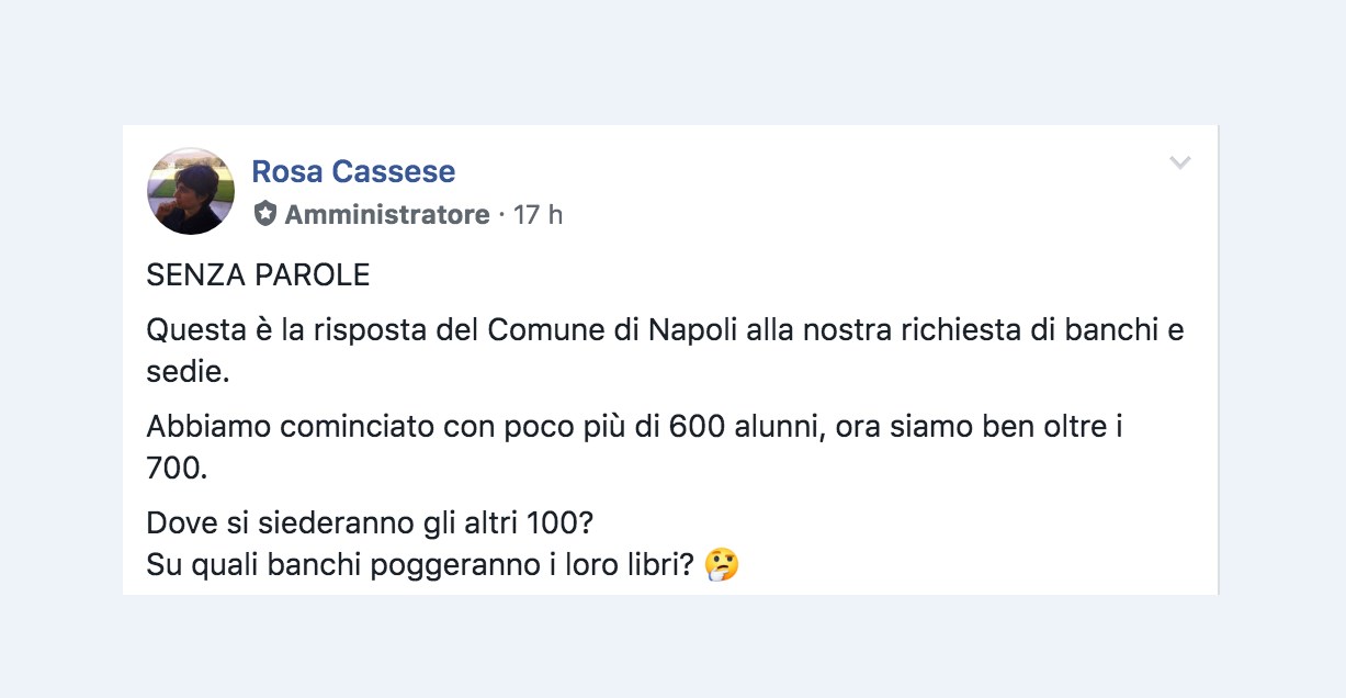 “SENZA PAROLE. Questa è la risposta del Comune di Napoli alla nostra richiesta di banchi e sedie. Abbiamo cominciato con poco più di 600 alunni, ora siamo ben oltre i 700. Dove si siederanno gli altri 100? Su quali banchi poggeranno i loro libri?“.