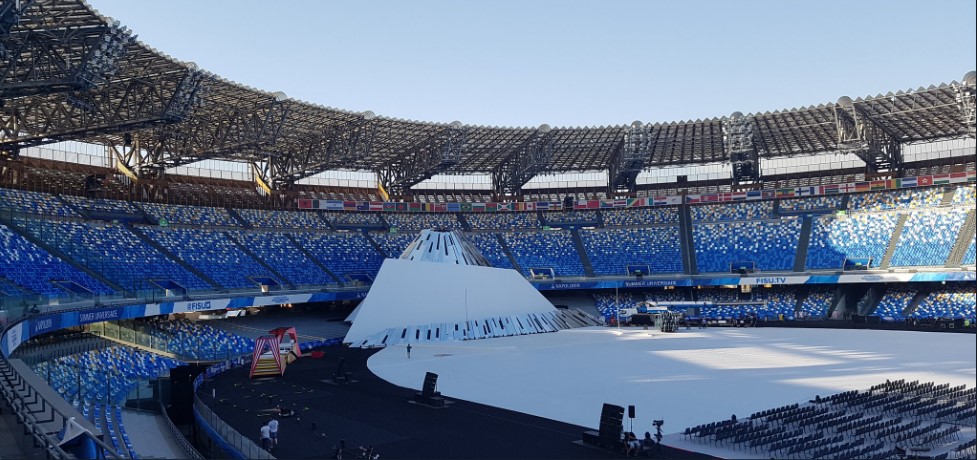 Davanti la Curva B, chiusa per l’occasione, c’è un vulcano tridimensionale per la cerimonia d’apertura delle Universiadi. Si illuminerà di rosso, ci sarà anche la lava, un effetto spettacolare. Ad aprire la cerimonia la sirena Partenope con uno strascico lungo 70 metri.