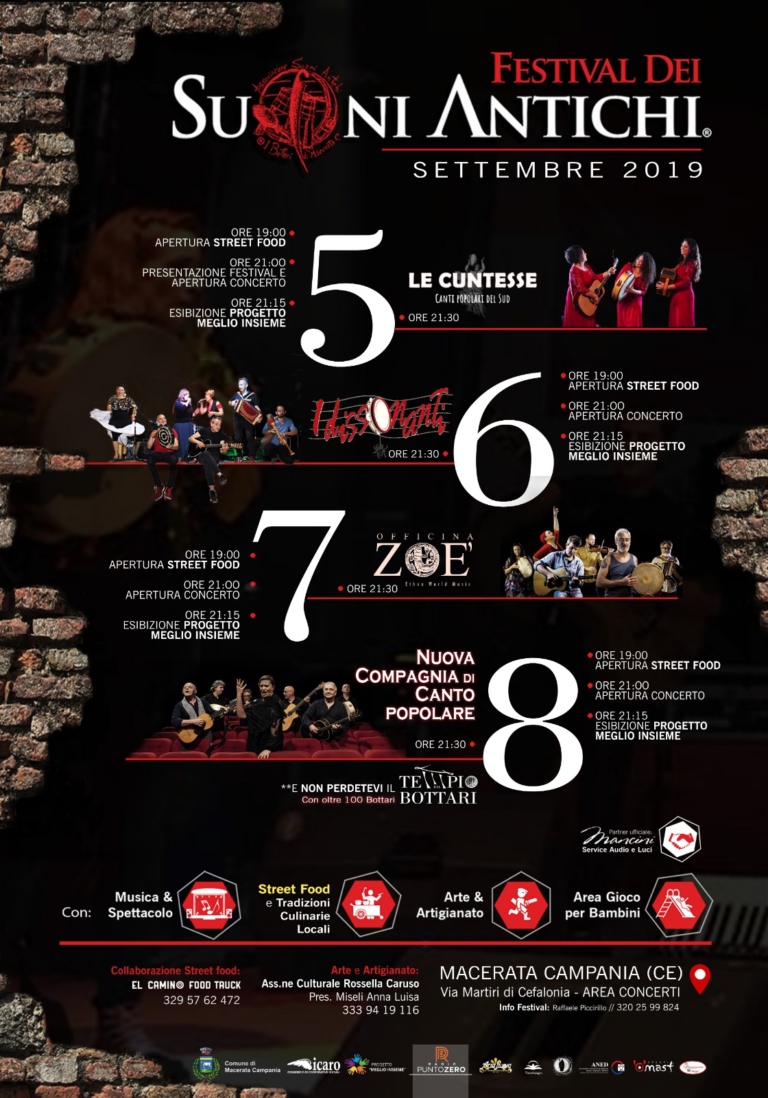 Ospiti della III edizione, con inizio dei concerti alle ore 21.30, saranno: 05/09 LE CUNTESSE – Canti popolari del Sud; 06/09 I DISSONANTI; 07/09 OFFICINA ZOÈ; 08/09 NUOVA COMPAGNIA DI CANTO POPOLARE. La serata finale dell’8 settembre vedrà anche la suggestiva esibizione di più di 100 bottari per l’evento nell’evento IL TEMPIO DEI BOTTARI. La serata sarà inoltre interamente trasmessa sulle frequenze di Radio Punto Zero. Ma il festival non è solo musica: anche quest’anno i suoni dei bottari si “mescolano” ai sapori della tradizione locale grazie al coinvolgimento dei trucks de EL CAMINO FOOD TRUCK dedicati allo street food che apriranno tutte e quattro le serate a partire dalle ore 19.00. L’area concerti ospiterà inoltre l’esposizione e la vendita di manufatti di artigianato locale grazie alla collaborazione con l’Associazione Culturale Rossella Caruso. Spazio, infine, anche per i più piccoli con l’allestimento di un’area gioco. Partner ufficiale dell’evento Mancini Service Audio Luci.