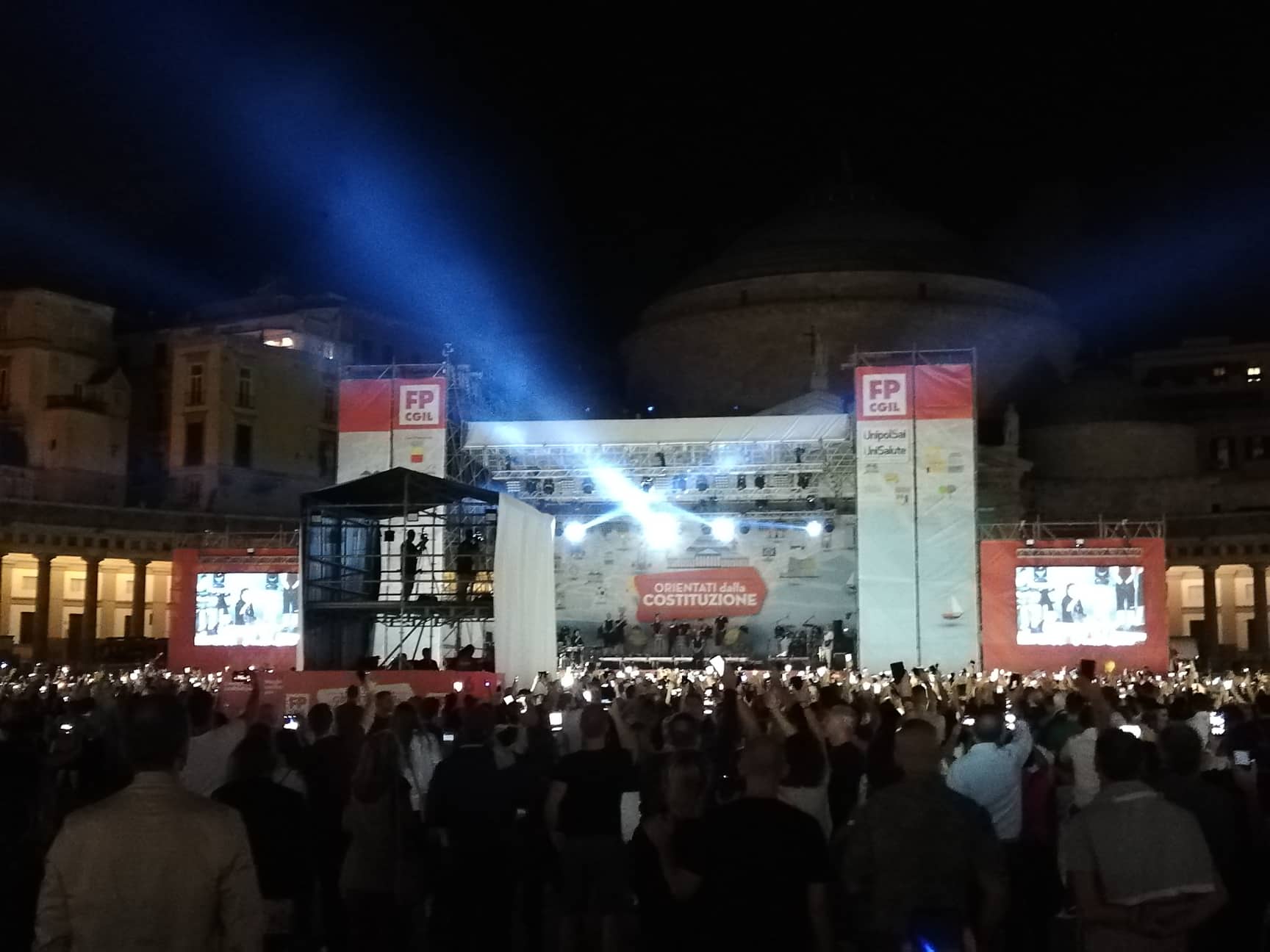 Ed è così che in una Piazza del Plebiscito affollata, l’artista di Marianella si è esibito in una versione intima e affascinante di Terra Mia. Cellulari e accendini alti verso il cielo per un gioco i luci che ha accompagnato Avitabile nella sua performance.