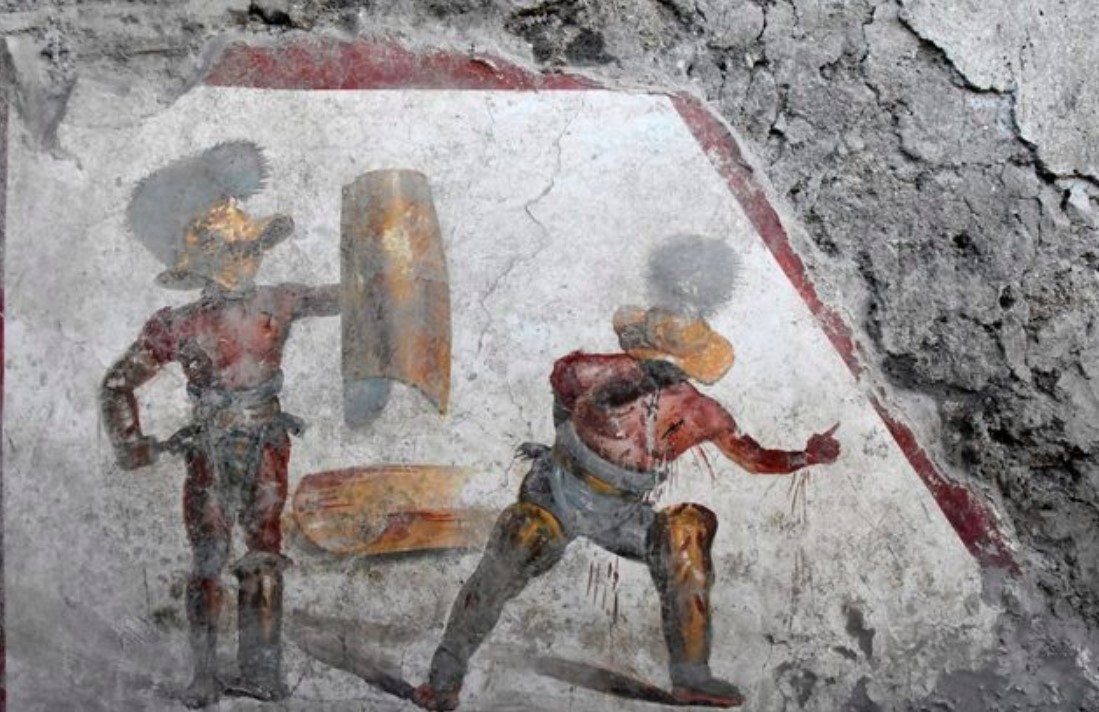 Nuova eccezionale scoperta a Pompei (Napoli). Due gladiatori al termine del combattimento, l’uno vince l’altro soccombe rappresentano la scena dell’ultimo affresco rinvenuto nell’area di cantiere della Regio V, nell’ambito dei lavori di messa in sicurezza e rimodulazione dei fronti di scavo, previsti dal Grande Progetto Pompei. Si tratta della scena di un combattimento tra un «Mirmillone» e un «Trace», due tipologie di lottatori distinti da armature differenti e classici avversari nelle lotte gladiatorie.